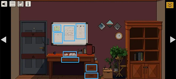 点击黑板上的绿色纸条,取得贝拉关于关窗、电池与胶带存放位置的提示。