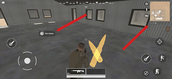 5、出生区域为我方安全区,可在此进行弹药补充、使用车辆、恢复生命值等操作;例如补充弹药,走到弹药点后点击get ammo即可。