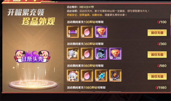 活动描述:开服前七天累计充值达到指定额度,即可领取绝版珍宝、珍稀道具、炫酷时装等豪华大礼。
