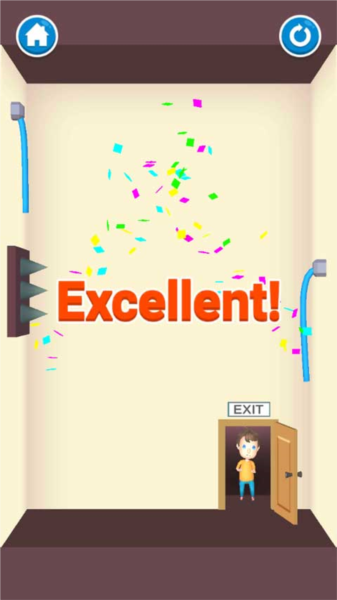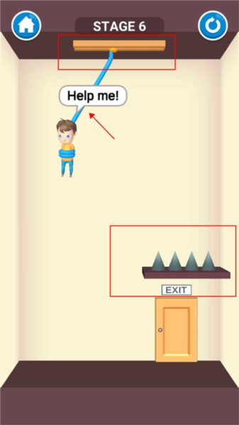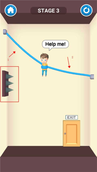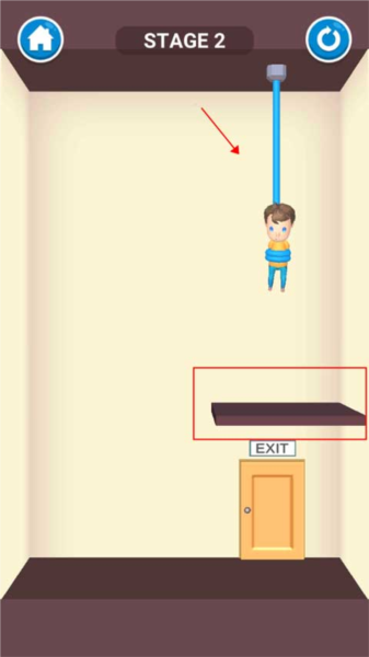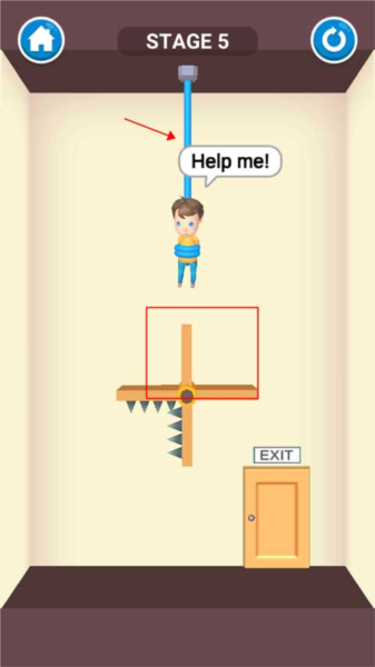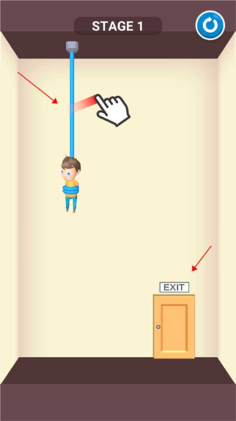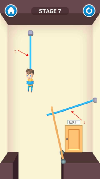 这一关只需用手指划过吊起小孩的绳子,孩子被解救后会自行走向出口,关卡即可通过。