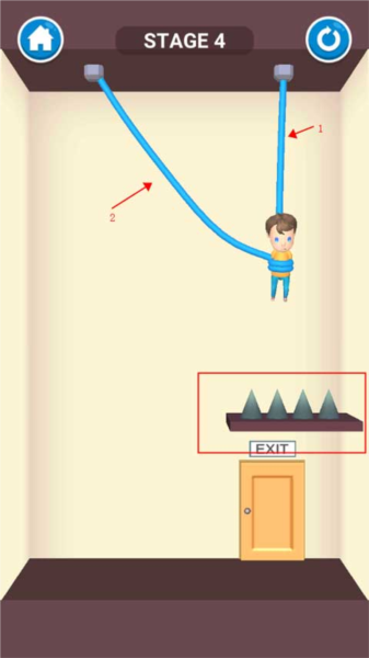 尖刺这次被放在孩子正下方,剪错绳子会导致失败,玩家也无法获得兑换皮肤的金币,请按照标注顺序剪断绳索。