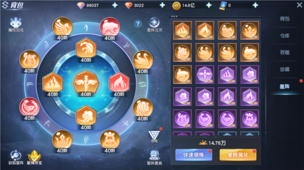 星阵装备主要通过星海夺王玩法及寻宝产出,获取后可直接穿戴。星阵分为八星、四象和中央神宫三种类型,共计13个部位。每个部件拥有蓝、紫、橙、红、粉五种品质,并分为40个阶位。品质越高、阶位越高,星阵提供的属性加成就越强,带来的战力提升也越显著。