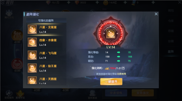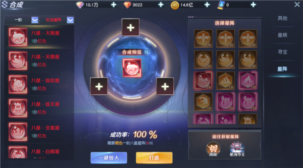 相同类型、相同阶位的橙色星阵可合成为指定部位的红色星阵(6阶前3合1,7阶后5合1);相同类型、相同阶位的红色星阵可合成为指定部位的粉色星阵(6阶前3合1,7阶后5合1)。红色合成粉色仅对5阶以上星阵开放,且需消耗特定升品道具:八星星阵需消耗星阵合成神石,四象与神宫星阵需消耗星阵合成圣石。升品道具主要通过星阵寻宝获得。
