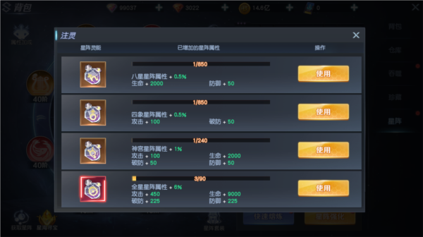在星海玩法中可获得四种类型的星阵灵能道具,使用后可提升对应类型星阵的百分比属性。