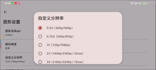 6、若手机配置较低,例如采用骁龙6系列处理器,可将模拟分辨率调整为0.5倍,以较低画质换取更稳定的运行效果。
