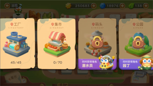 游戏包含五个主要场景:工厂、集市、码头、公园和游乐场。