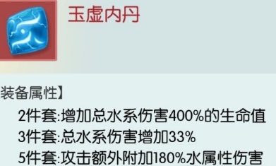 可以看出,三件套效果加成的是总水系伤害,包括装备、丹药等途径获得的五行属性,且直接体现在面板上。