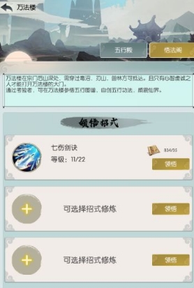 万法楼包含五行殿与悟法阁,悟法阁用于将已满级的招式进一步提升等级。