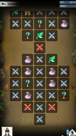 秘境地图由多种功能格构成:剑形图标代表战斗,胜利可获得丰厚奖励;布袋图标可领取各类强化状态;绿叶图标用于恢复生命;黄色房屋为秘境商店,可使用战斗中获得的“奥力币”兑换道具;问号图标则触发随机事件,充满不确定性。
