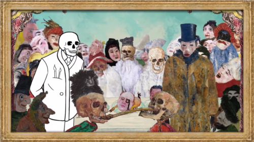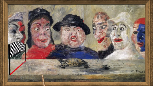 1、创作灵感源自比利时现代艺术家詹姆斯·恩索尔的作品,采用超现实主义油画风格,营造出奇异而怪诞的视觉世界;