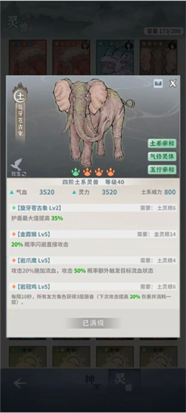 理想搭配为大象、猴子、鹰与鸡的组合;拥有土亲和与五行亲和,所有属性均可获得1.5倍加成,非常适合金气辅助角色;首先主力胚子可直接获得,或通过大象吞噬五级猴子合成,即A加B等于AB;
