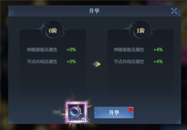5、神赐升华:可消耗神谕之兆提升神赐升华等级,提升后能按百分比增加已装备神赐的属性及节点共鸣提供的固定值属性;未装备神赐的孔位不享受此加成。