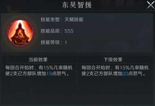 天赋技能有15%概率为两支友军部队回复怒气;触发几率虽不突出,但作为额外增益,关键时刻可能改变战局。