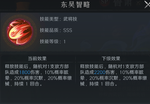 其主动技能可对单体目标造成伤害,并分别有10%概率附加眩晕、20%概率附加缴械(禁止普通攻击)、20%概率附加沉默(禁止释放技能);综合控制触发概率可达50%。在战役或征途副本中,通过多次尝试并配合鲁肃的控制,有助于攻克难关。