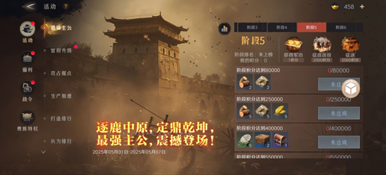 1. 官府升级时获得的资质提升次数与装备改造机会,建议暂不领取,可保留至“最强主公”活动第二天或第四天集中使用。