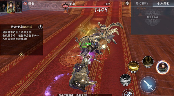 第三关洛阳皇宫,挑战BOSS董卓,根据势力伤害与个人伤害排名发放奖励。