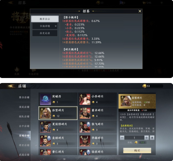 招募卡池包含红将与橙将,无金将;红将分18资质与16资质。新手30抽必得16资质,100抽必得18资质。推荐顺序为18资质赵云、小乔、夏侯惇、董卓;小乔为唯一女性武将,可通过小额获取。招募积分可兑换碎片,建议培养夏侯惇或小乔;元宝可优先用于武将列传。