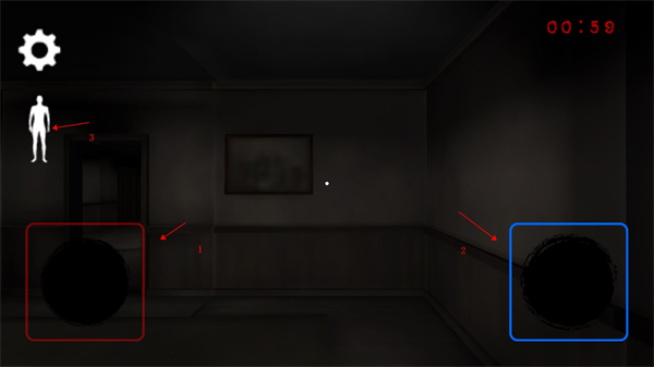 4、图中标号1的按钮控制角色移动,标号2按钮控制视角方向,标号3则用于蹲下或站起;通过操控角色设法逃离房间即可通关。