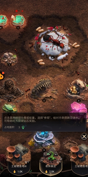 3、通过赚取宝石来增加蚁群数量、强化能力,见证蚂蚁规模成长,获得满足感。
