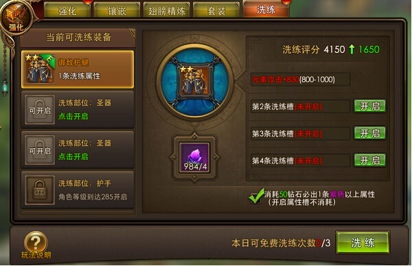 若多次洗练结果不佳,可消耗一定钻石确保至少生成一条紫色及以上品质的属性。