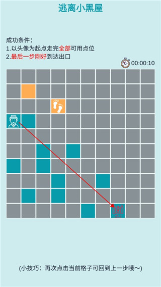 4、你需要通过点击所有蓝色格子移动到门口;每次只能点击蓝色格子,点击后会变为橙色,必须经过每一个蓝色格子。