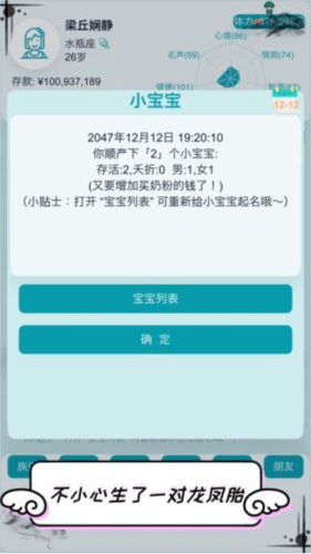 结婚生子系统;只要具备足够的经济条件,你可以养育多个子女,并自由选择培养方式;各种随机事件将持续带来惊喜。
