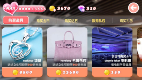 5.通过赠送礼物、共同购物等行为提升亲密度,模拟真实恋爱过程。