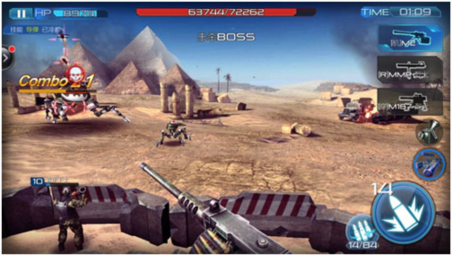 关卡1-6的BOSS难度提升不大,前期小怪种类较少;击败几波小怪后,将遭遇一名女性BOSS,同样通过扫射并攻击其弱点即可击败。