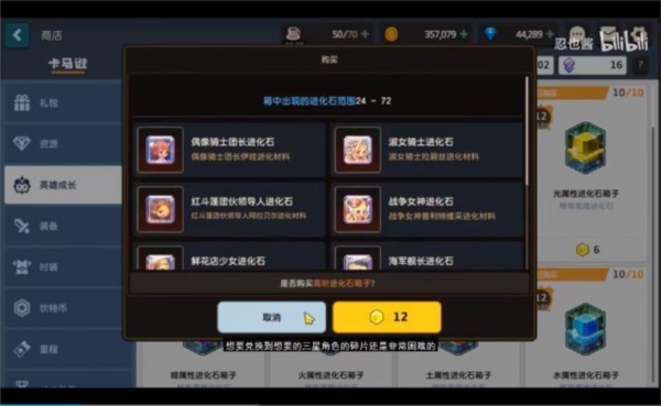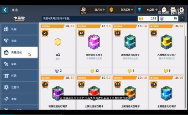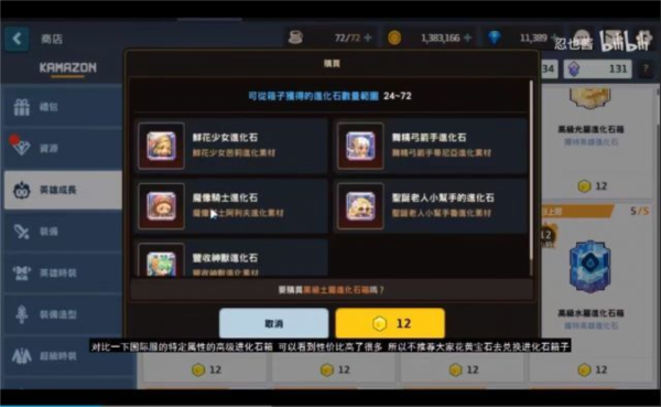 英雄成长区用黄色宝石兑换的进化箱子同样性价比低。