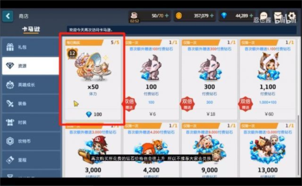 大家好,本期带来商店兑换指南。首先看资源区的体力购买,游戏内体力定价较高,首次购买需一百钻石,后续价格递增,因此不建议兑换。