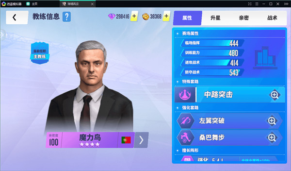 点击任意教练头像可进入养成界面,查看其属性、战术与擅长阵型;教练最高可升至五星,解锁更多阵型与战术。亲密度影响教练属性发挥,满级后还能提升全队球员属性。各品质教练可镶嵌对应品质的战术书,大幅增强战力,但战术书获取难度较高。