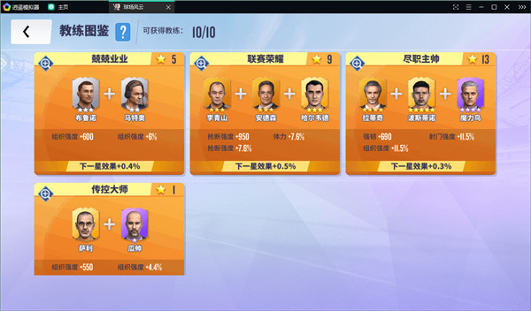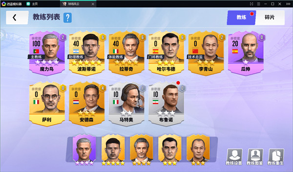 进入教练页面可查看现有教练组成员;目前有穆里尼奥与瓜迪奥拉两位紫色教练,另有闪金、金色与银色教练若干。紫色与闪金教练主要通过嘉年华活动获取;穆里尼奥也可通过每日体力消耗概率出现;限时充值活动或联盟等级礼包等途径也能获得部分碎片。