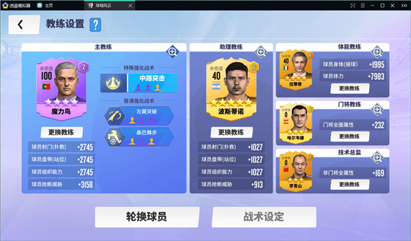 教练设置中包含主教练战术、助力教练、体能教练、门将教练与技术总监的配置选项;下方为轮换球员设置,替补加成相对有限,无需刻意追求。