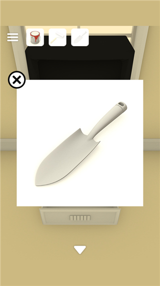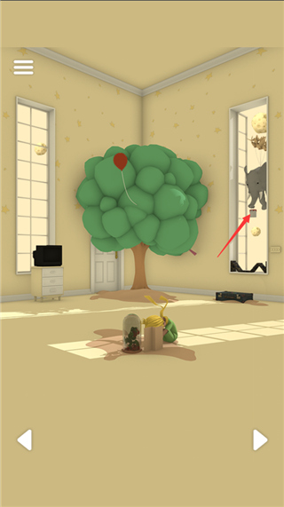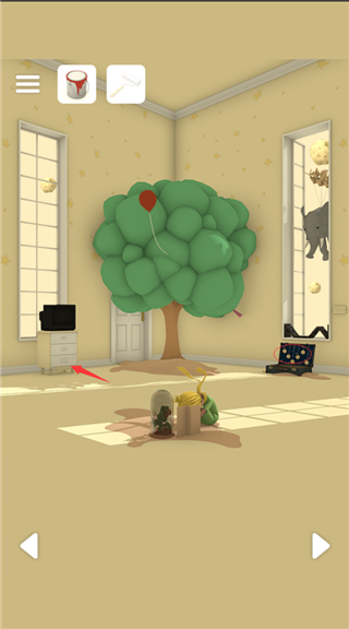1、首先找到油漆桶,来到有树的房间,点击墙边的机关,密码参考画板上的箭头方向:上、右、下、右上;点击大象获取油漆;