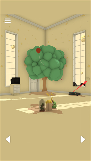 1、来到有树的房间,点击墙边机关,密码参考画板提示:上、右、下、右上;