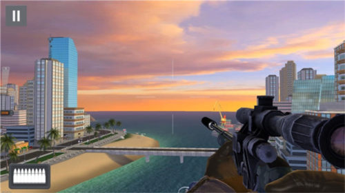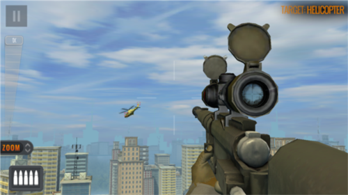 游戏遵循狙击手隐蔽行动的原则,角色固定不动,等待目标出现;通过滑动屏幕控制瞄准位置,拖动左侧缩放按钮调整狙击镜放大倍数,拉到最高时倍数最大;点击左下角子弹图标即可射击,使用高倍镜射击后,右上方会出现装弹按钮,点击即可填装,当前子弹数显示在屏幕左下角;