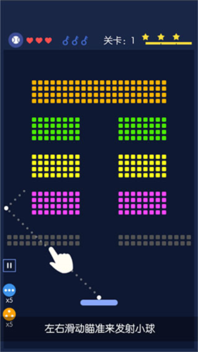 2、左右滑动瞄准并发射小球,注意从灰色砖块间隙中穿出;