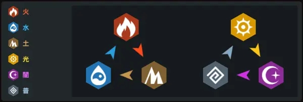 属性克制时,造成130%伤害;属性被克制时,造成70%伤害;属性中立时,造成100%伤害。下图展示了属性间的克制关系。