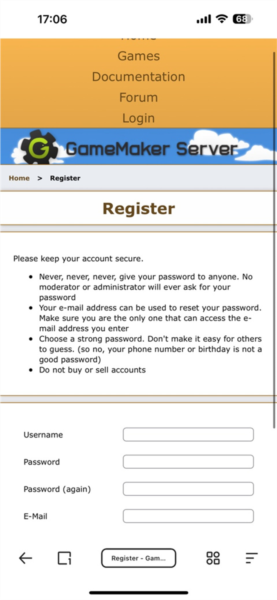 3、根据紫色方框中的网址,在浏览器中输入地址:gamemakerserver.com/en/register。