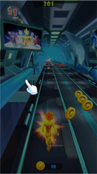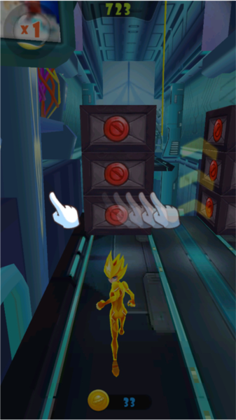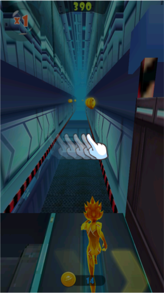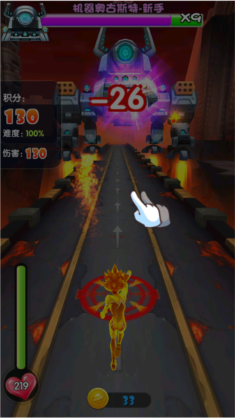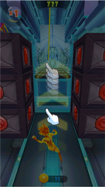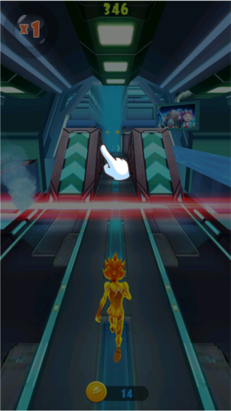 5、遇到横向激光障碍时,向下滑动屏幕,控制角色俯身滑行通过;