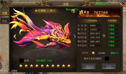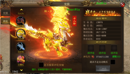 2、坐骑可进行神化,获得更炫酷外观与更多属性加成。