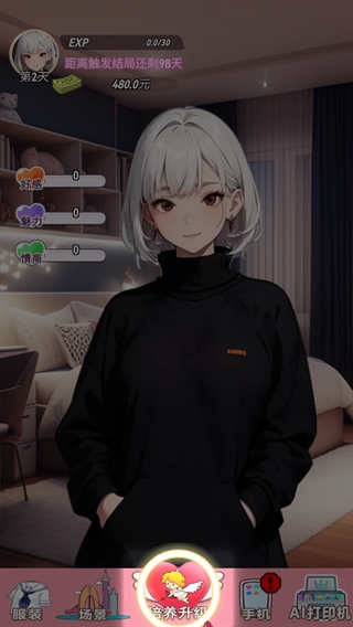 4. 在手机界面推进主线剧情,积累财富;并为角色购置多样服饰,如小香风外套或双马尾造型,通过换装解锁新的故事片段。