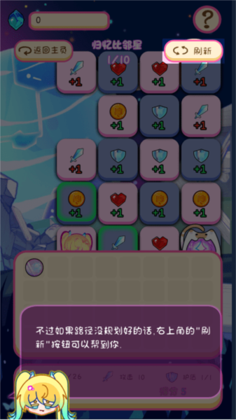 角色每前进一格,后方格子会消失;点击刷新可重置地图布局。