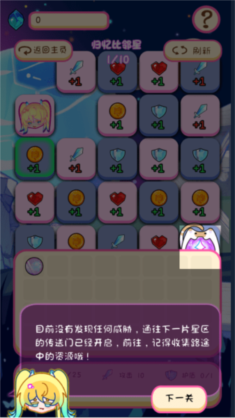 3、在5x5的地图上点击移动,经过的格子会消失,需要规划路径以收集物资并应对战斗;