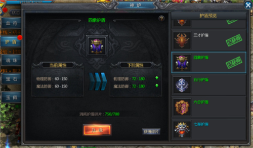 在神炉系统的护盾界面中,护盾分为10个等级。等级越高,提供的双防加成越显著。低阶护盾可使用碎片进行升级,获得更坚固的防护效果。