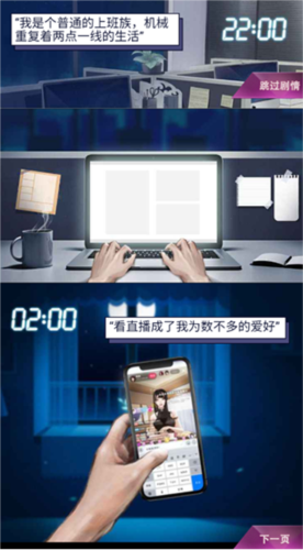 1、进入游戏后,首先了解背景故事:主角凭借偶然获得的启动资金,踏上了创建主播公司的创业之路。