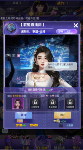 2、女神云集,卡牌养成:收集各类美女主播卡牌,通过培养提升她们的魅力与技能,组建独具特色的直播团队,吸引更多观众关注。