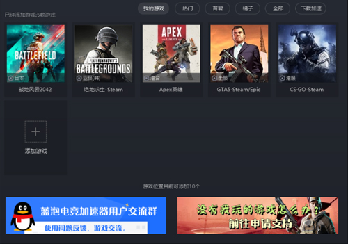 2、支持包括绝地求生、GTA5在内的大量热门游戏加速;