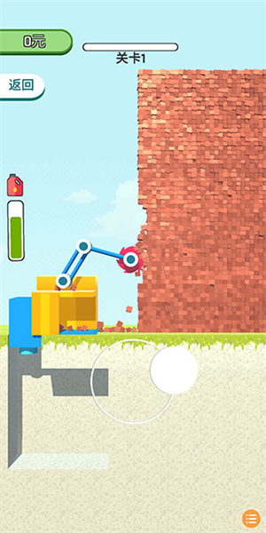 2、通过拖动屏幕下方的虚拟轮盘,可以控制拆迁机器对右侧建筑进行拆除。