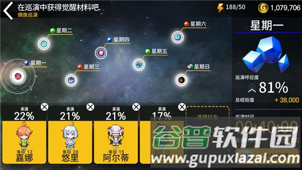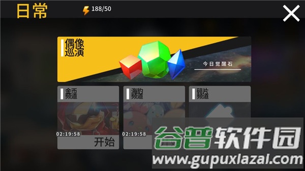 2、例如某偶像需要蓝色觉醒石,则应在周一或周四进行巡演;周二与周五产出绿色材料;周三与周六产出红色材料。